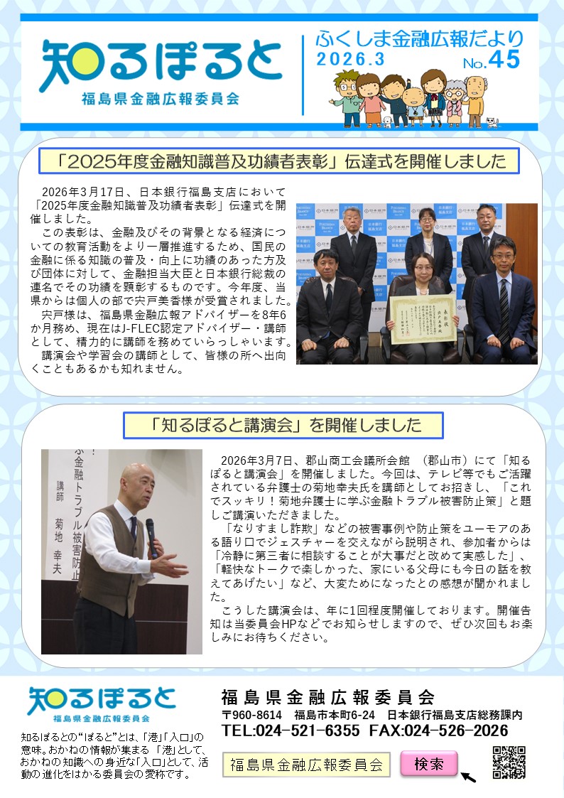 福島県金融広報委員会(愛称:知るぽると福島)は、福島県、財務省東北財務局福島財務事務所、日本銀行福島支店、県下金融機関団体等によって構成される中立・公正な団体です。