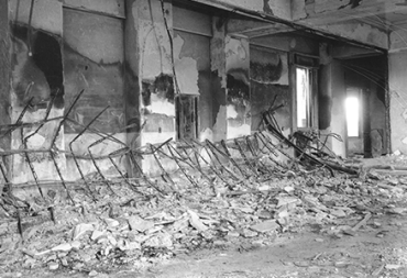 Upon the bombing, the gates, window frames, shutters, and glass doors of the office were all blown away by the blast, and the glass roof in the center of the rooftop, along with the shutter covers, was bent like candy and wrecked. However, there was no structural damage to the building itself, and the ceiling did not fall.